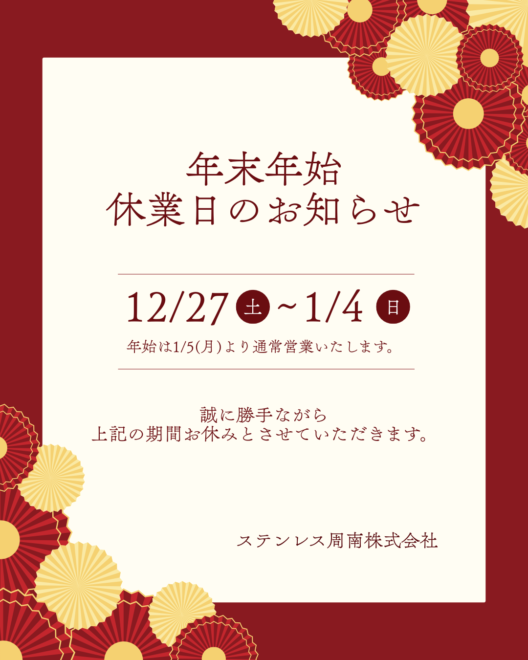 誠に勝手ながら、弊社は下記の期間を年末年始休業とさせていただきます。